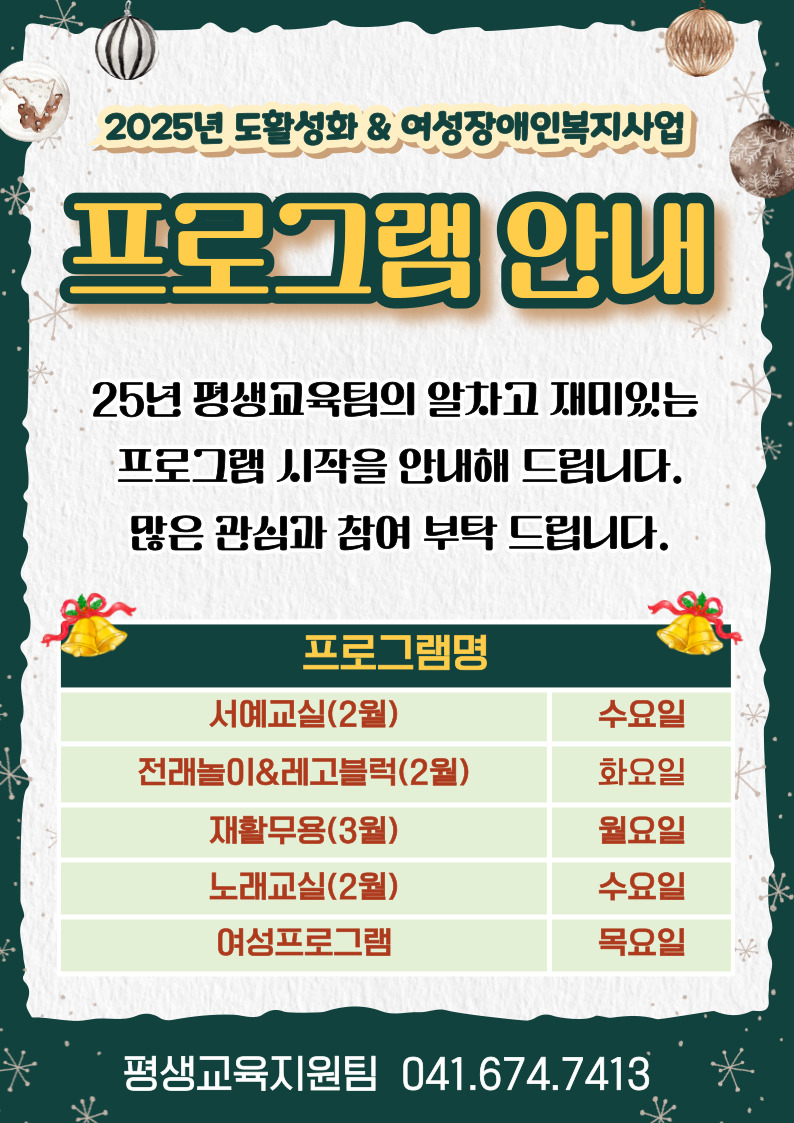 2025도활성화 & 여성장애인복지사업 프로그램 안내 평생교육지원팀윤정현 0 1202 2025.01.02 17:55 25년 평생교육팀의 알차고 재미있는 프로그램 시작을 안내해 드립니다.많은 관심과 참여 부탁 드립니다.^^