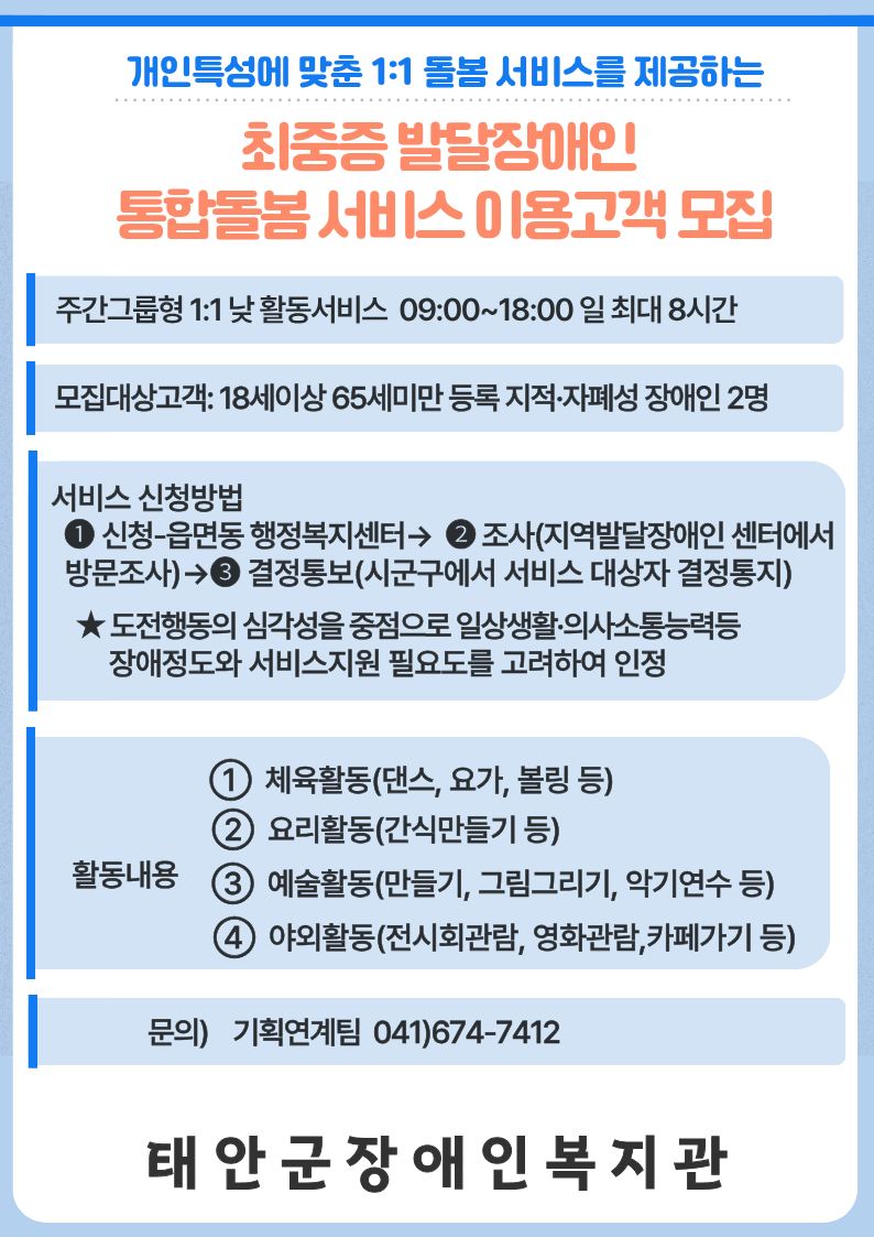 최중증 발달장애인 통합돌봄 고객 모집 복지관 0 348 2025.12.16 15:53 최중증 발달장애인 통합돌봄 서비스 고객을 모집합니다.최중증 발달장애인은 지적장애나 자폐성 장애 등 발달장애의 정도가 매우 심해, 일상생활 전반에서 상시적·전면적인 지원이 필요한 사람을 말합니다.