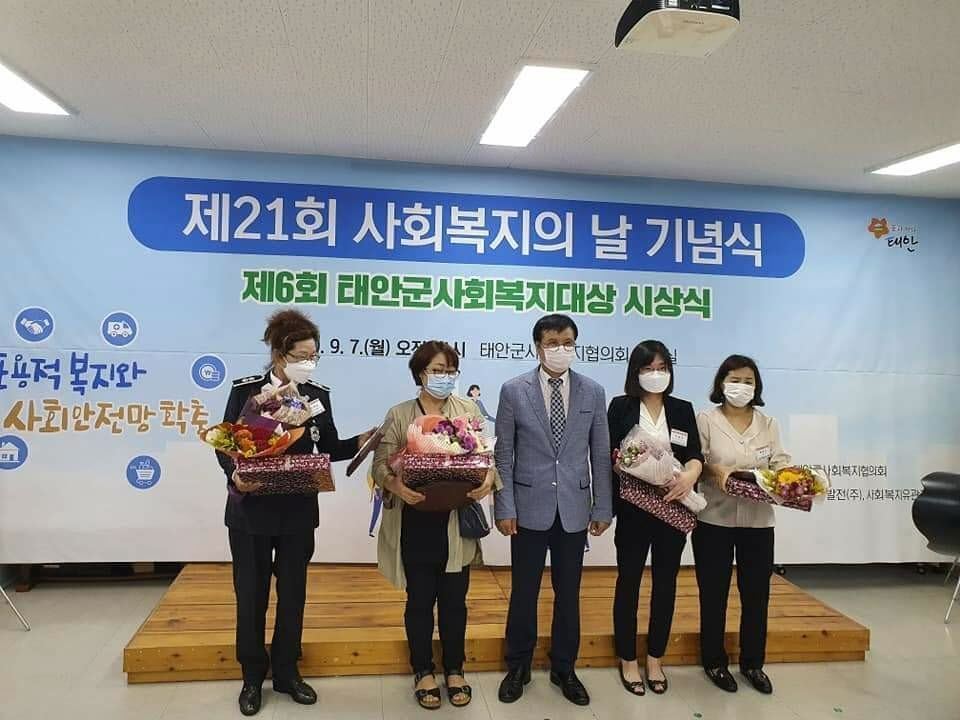 제21회 사회복지의날 기념 유공자 표창 조항수 0 1822 2020.09.09 12:56 제21회 사회복지의날 기념식 및 ㅂ제6회 태안군사회복지대상 시상식에서 태안군장애인복지관 윤혜영 선생님과 조규영 활동지원사님, 이창숙 자원봉사자님께서 수상을 하셨습니다
