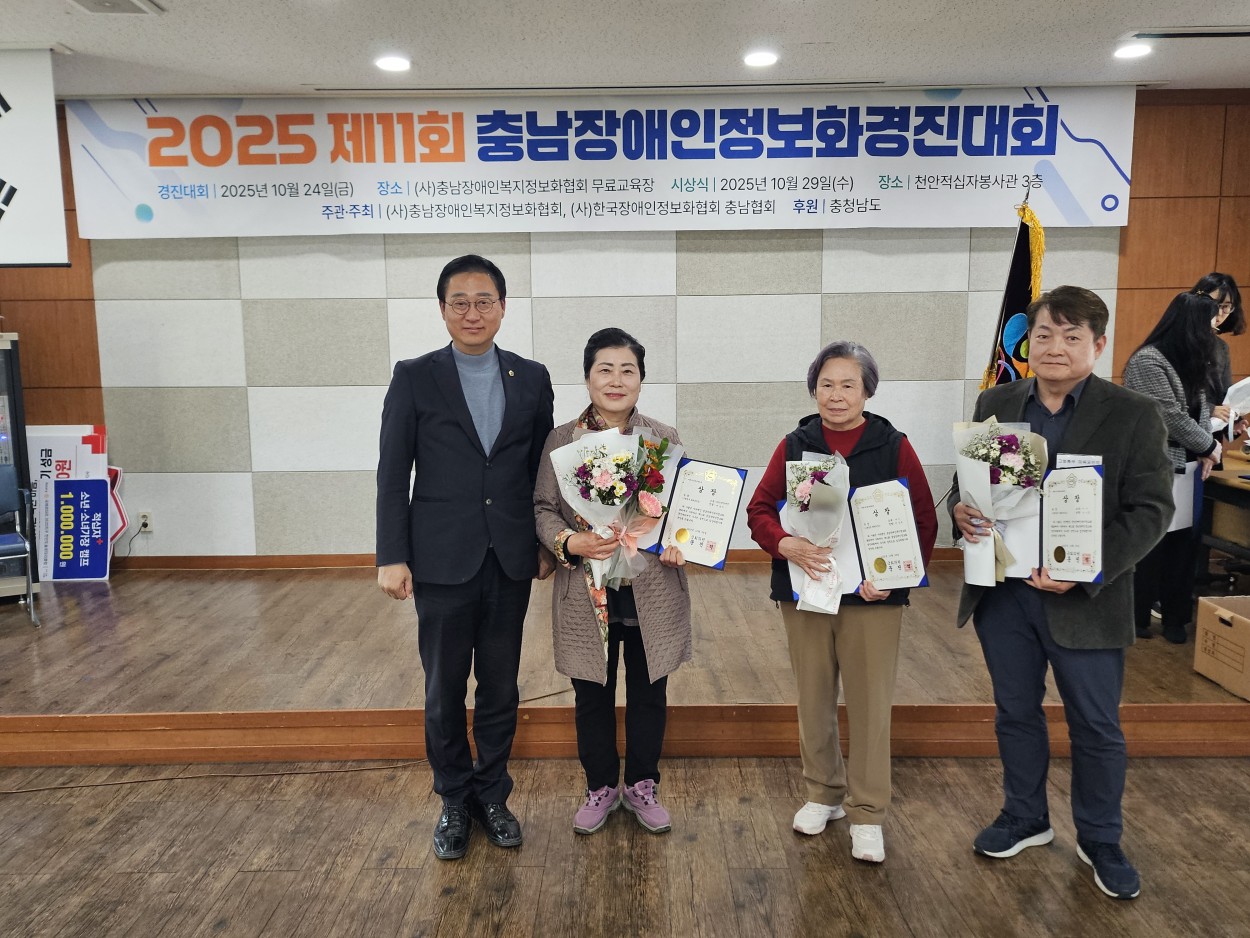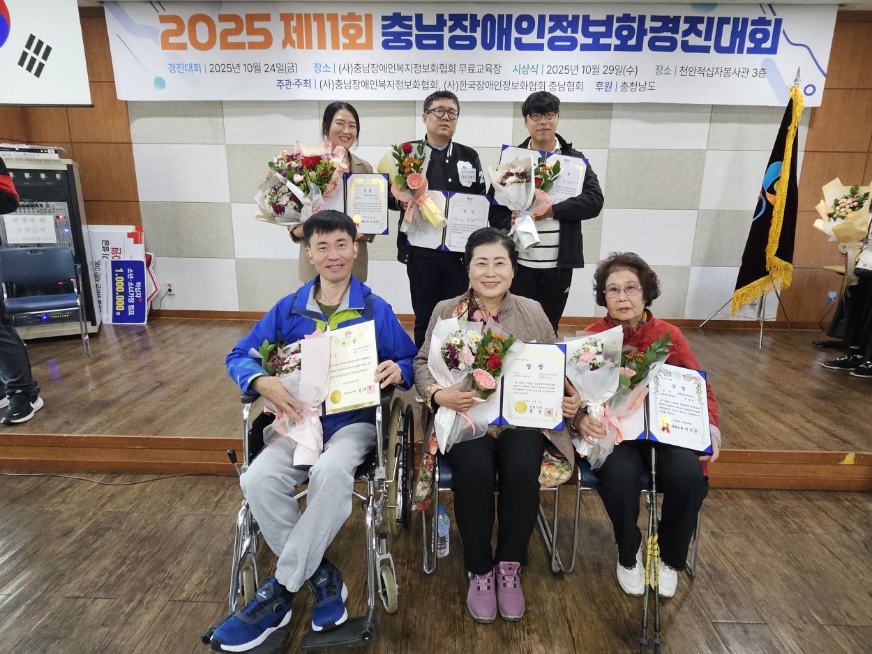 제11회 충남장애인정보화경진대회 시상식 평생교육지원팀윤정현 0 352 2025.10.31 09:25 * 2025년 10월 24일 경진대회에 참가해 10월 29일 우수한 성적으로 ▲ 지도자상- 윤정현 ▲문서작성(일반부)-김환민(동상) / ▲파워포인트(일반부)-남도현(동상) / ▲엑셀(일반부)-지재현(금상) / ▲문서작성(고령부)-신길자(은상) / ▲ 파워포인트(고령부)-박성옥(금상) 님이 수상의 영광을 차지하며 자리를 빛냈다. ~ 모두 모두 축하드립니다~^^