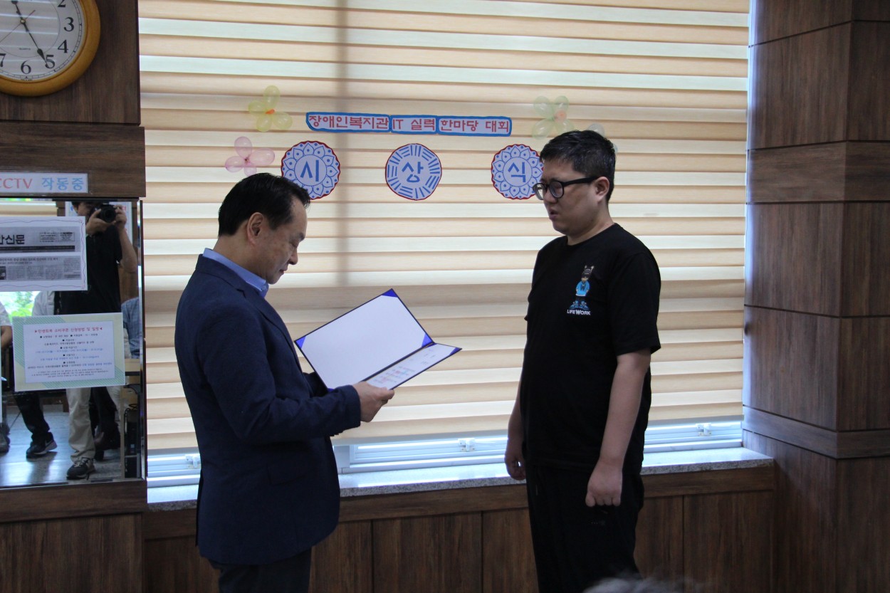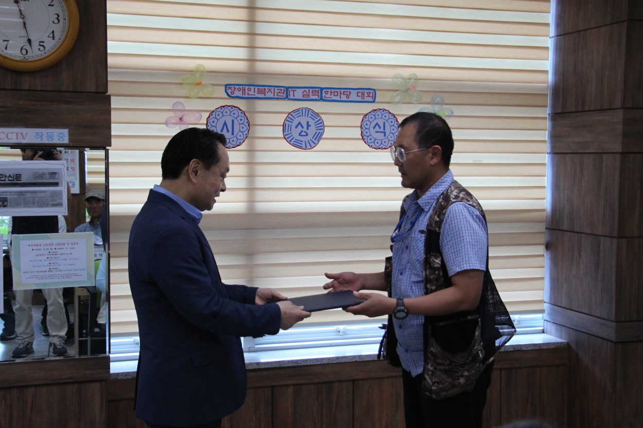 716() 정보화교육에 참여하는 프로그램 참여자들(10)이 장애인복지관 자체 IT실력 한마당대회에 참가하였다. 참가를 통해 자신감과 성취감을 고취시키고 자립과 정보격차를 해소하기 위한 대회였으며, 대회 시작전 모두 화이팅하며 마음을 다잡고 대회에 참여하는 모습도 보여 주었다. 723() 열심히 대회에 참여한 이용자들의 시상식이 있었으며, 시상은 장애인복지관장 이종만 관장님께서 시상해 주어 더 뜻깊은 시간으로 대회를 마무리 할 수 있었다.