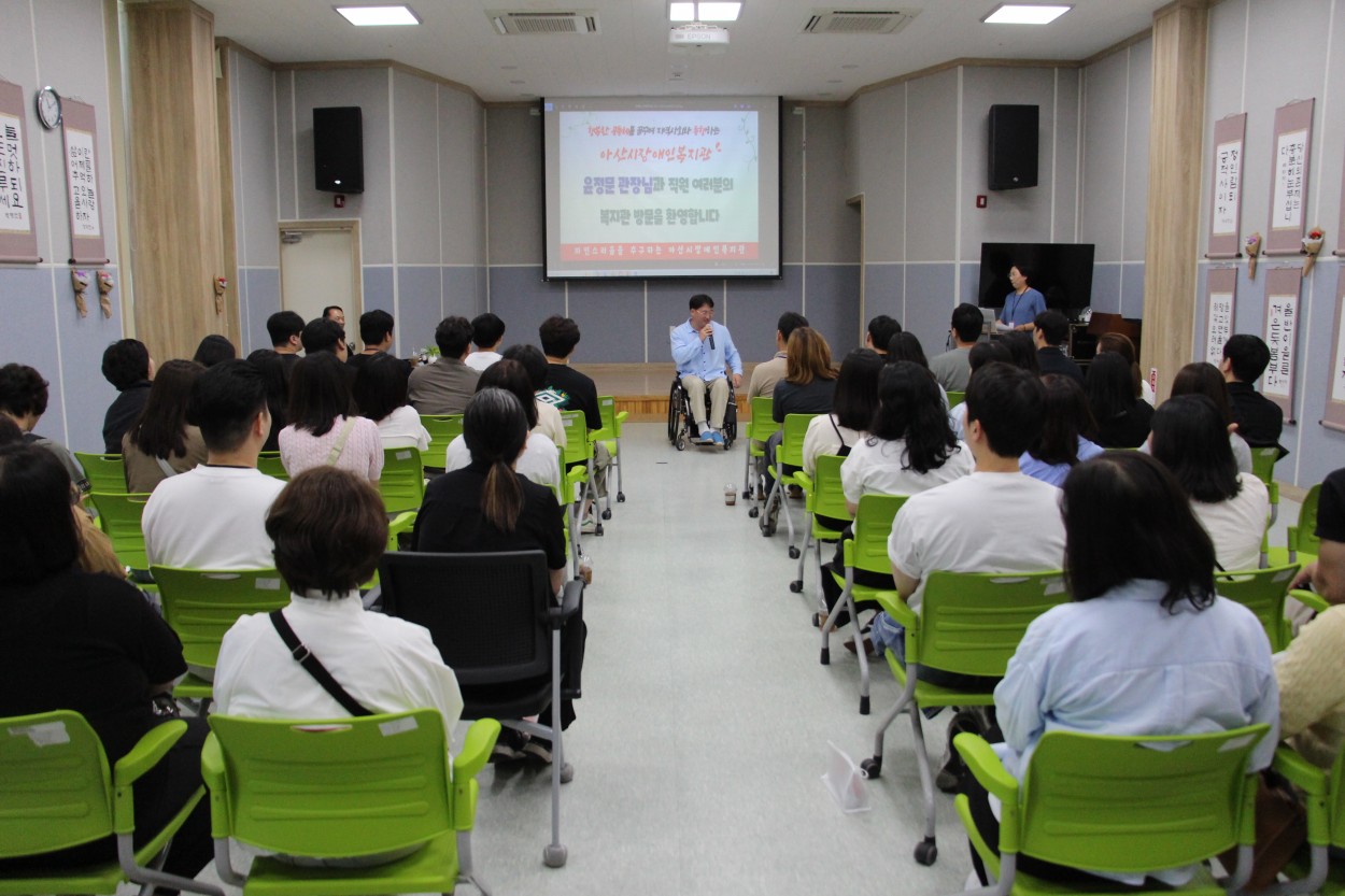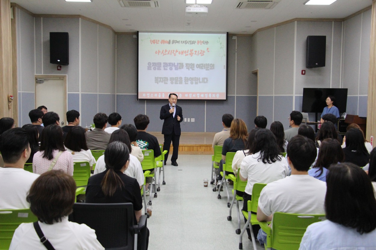 아산시장애인복지관에서 우리복지관 방문 복지관 0 746 2025.07.04 16:08 2025년 6월 26일 아산시장애인복지관 윤정문 관장님및 50여명의 직원이 우리복지관을 방문하여 정보 교류 및 시설 견학을 진행하였습니다. 앞으로도 지속적인 교류를 통해 더 나은 복지서비스를 함께 만들어가겠습니다.