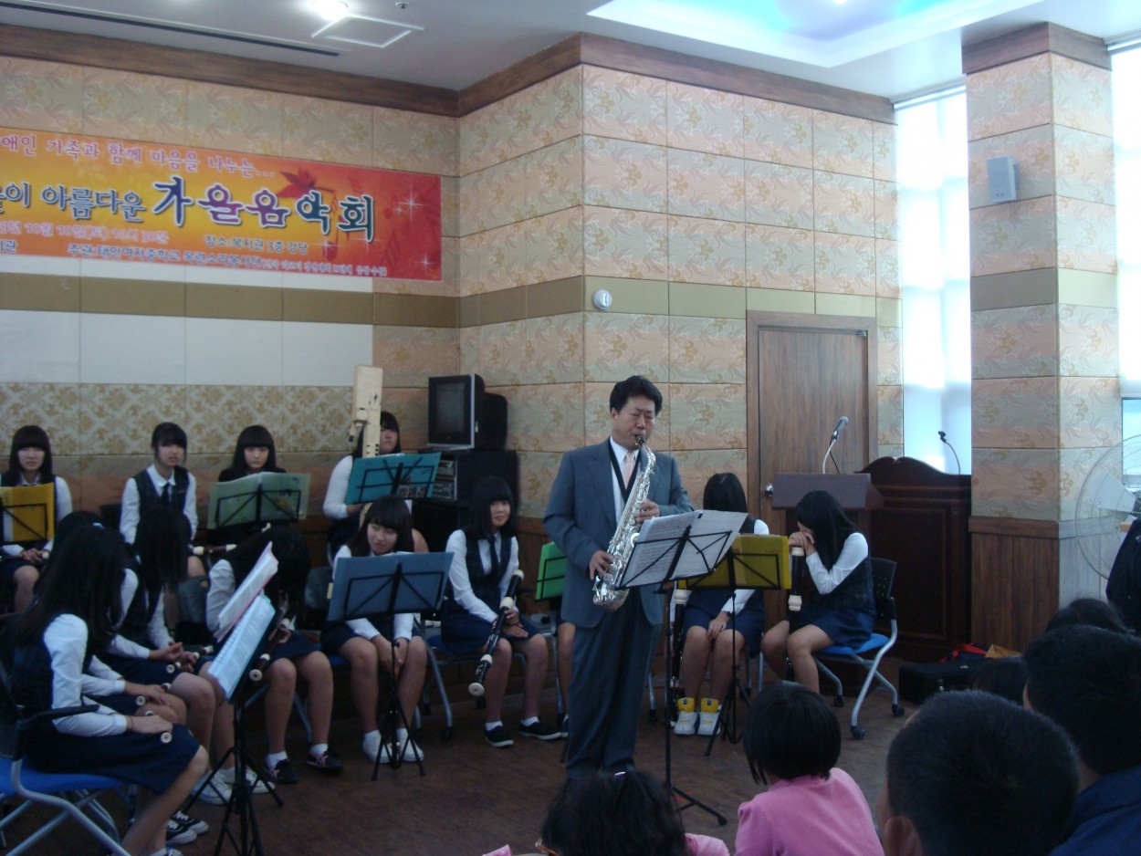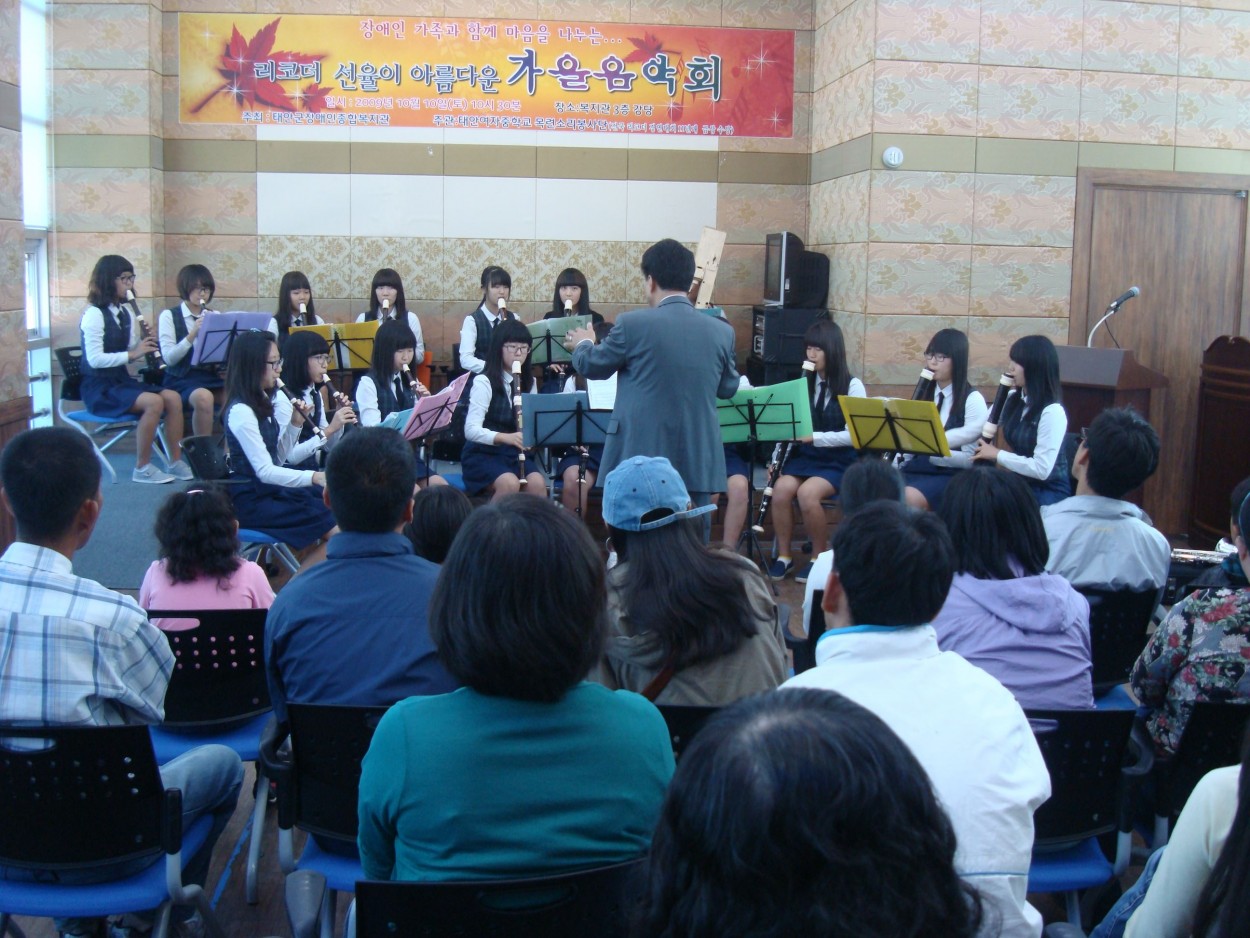 장애인가족과 함께 하는 가을 음악회 박효성 0 2455 2009.10.15 10:17 장애인가족과 함께 마음을 나누는 가을 음악회가 지난 10일 (토)에 이영용선생님의 지휘하에 태안여자중학교 목련소리봉사단에서 리코더 선율과 섹스폰이 어울어지는 아름다운 공연으로 열렸다.