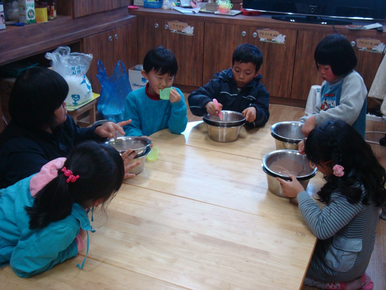 방과후교실 아이들이 3월 6일 복지관 2층 사회교육실에서 아이스크림을 만드는 모습