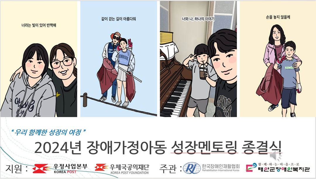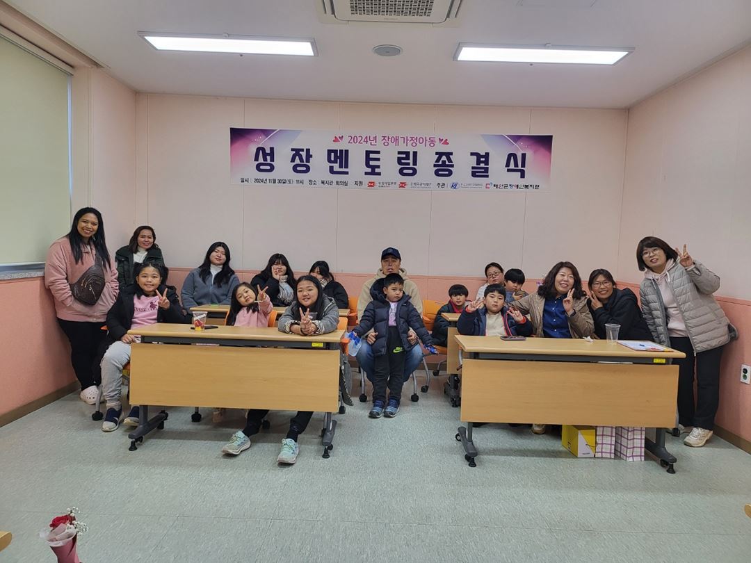 2024년 장애가정아동 성장멘토링 종결식 상담사례지원팀가민선 0 914 2024.12.02 17:58 2024년 11월 30일(토) 장애가정아동 성장멘토링 종결식을 진행하였습니다.올 4월~11월 8개월간 함께한 멘티, 멘토, 멘티가족을 모시고 성과보고, 꿈사랑 장학증서 전달, 우수멘토상 시상, 활동소감 순으로 마무리를 하였습니다.