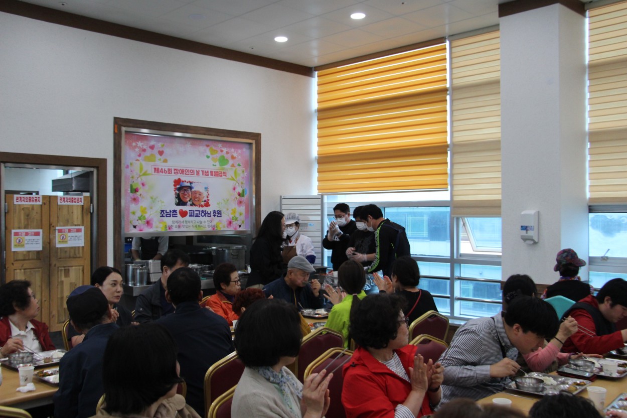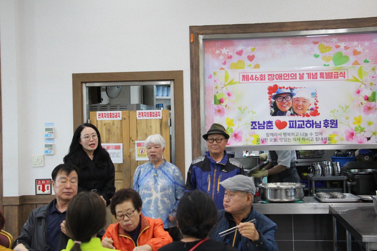 이날 급식은 조남춘, 피교하 부부의 100만원 후원으로 더욱 풍성하게 제공됐다. 두 후원자는 매년 꾸준한 지원을 통해 장애인의 날 특별급식을 이어오고 있으며, 여름철에는 보양식까지 마련하는 등 지속적인 나눔을 실천해 지역사회에 귀감이 되고 있습니다.